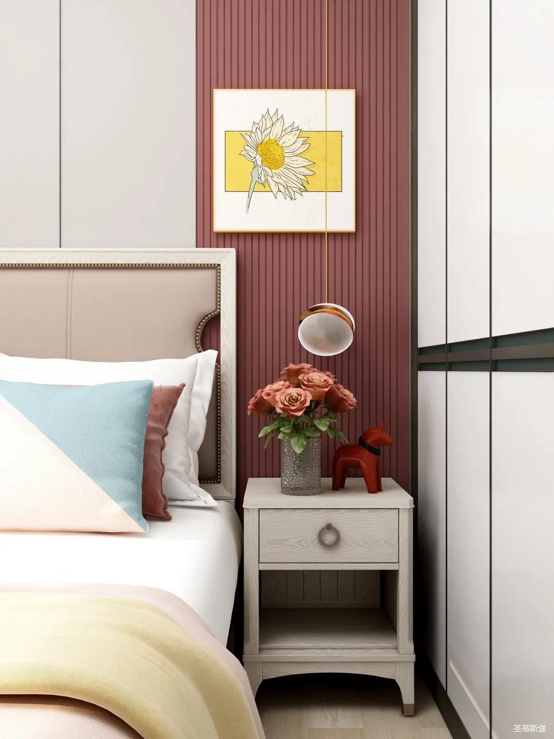 儿童空间虽不及其他空间宽敞,但细节设计更为贴心,淡粉的床屏与酒红木饰面形成深浅色的对比,色彩跳跃,洋溢着儿童应有的青春活力。床前的阅读灯,让空间设计感up的同时,也便利了儿童的阅读学习。