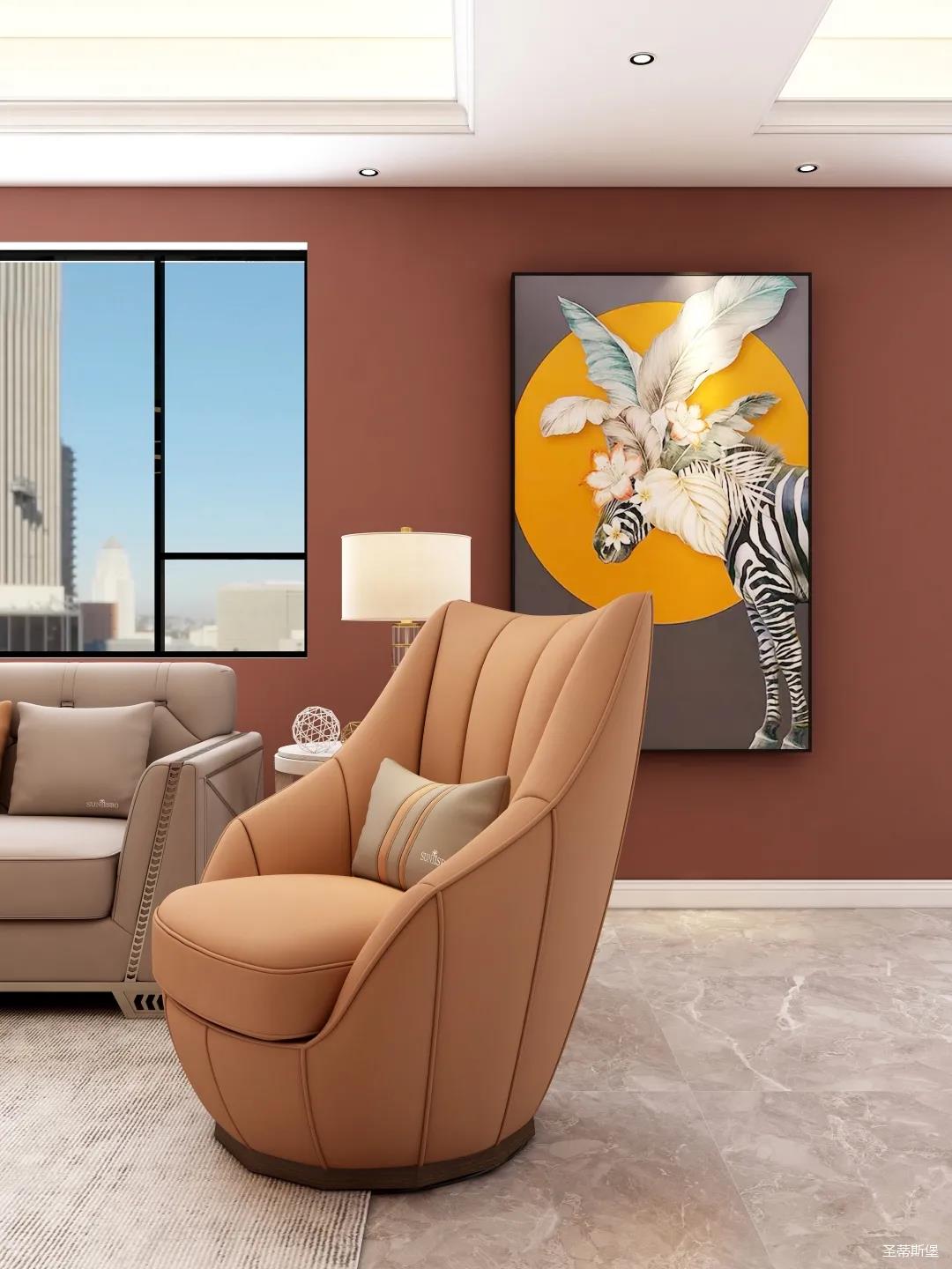 表姐不喜欢大白墙设计,于是设计师完美贴合表姐的喜好,摒弃了传统的大白墙,将色彩跳跃的铁锈红应用于空间,从视觉上丰富了空间的层次感。南北通透的空间布局,让视野更为清透明亮。